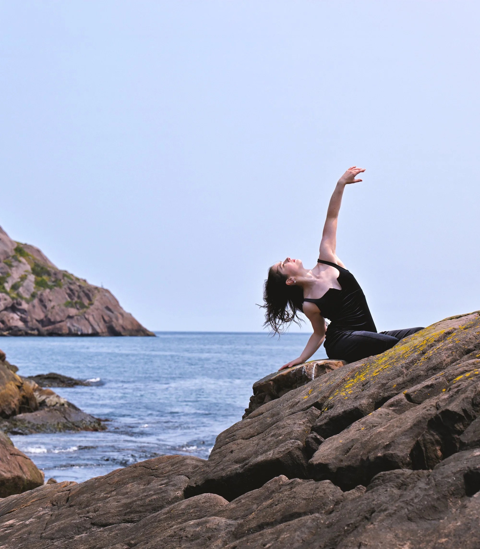 A female dancer wearing black with arm elegantly raised, sitting on a lichen-covered rock next to the Atlantic Ocean, with a cliff in the distance.